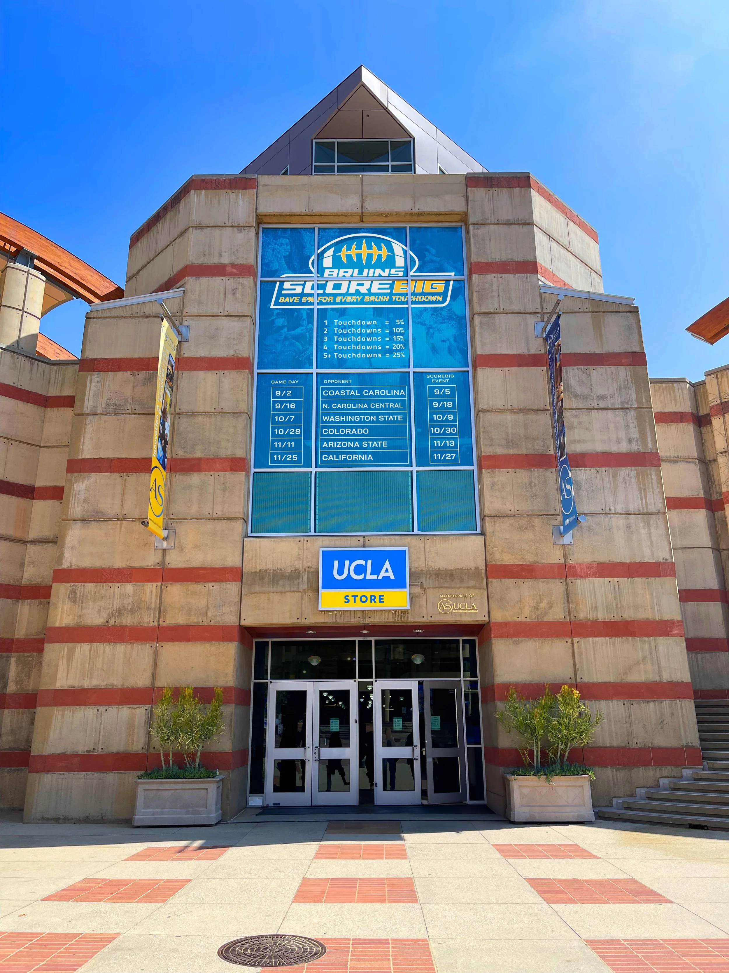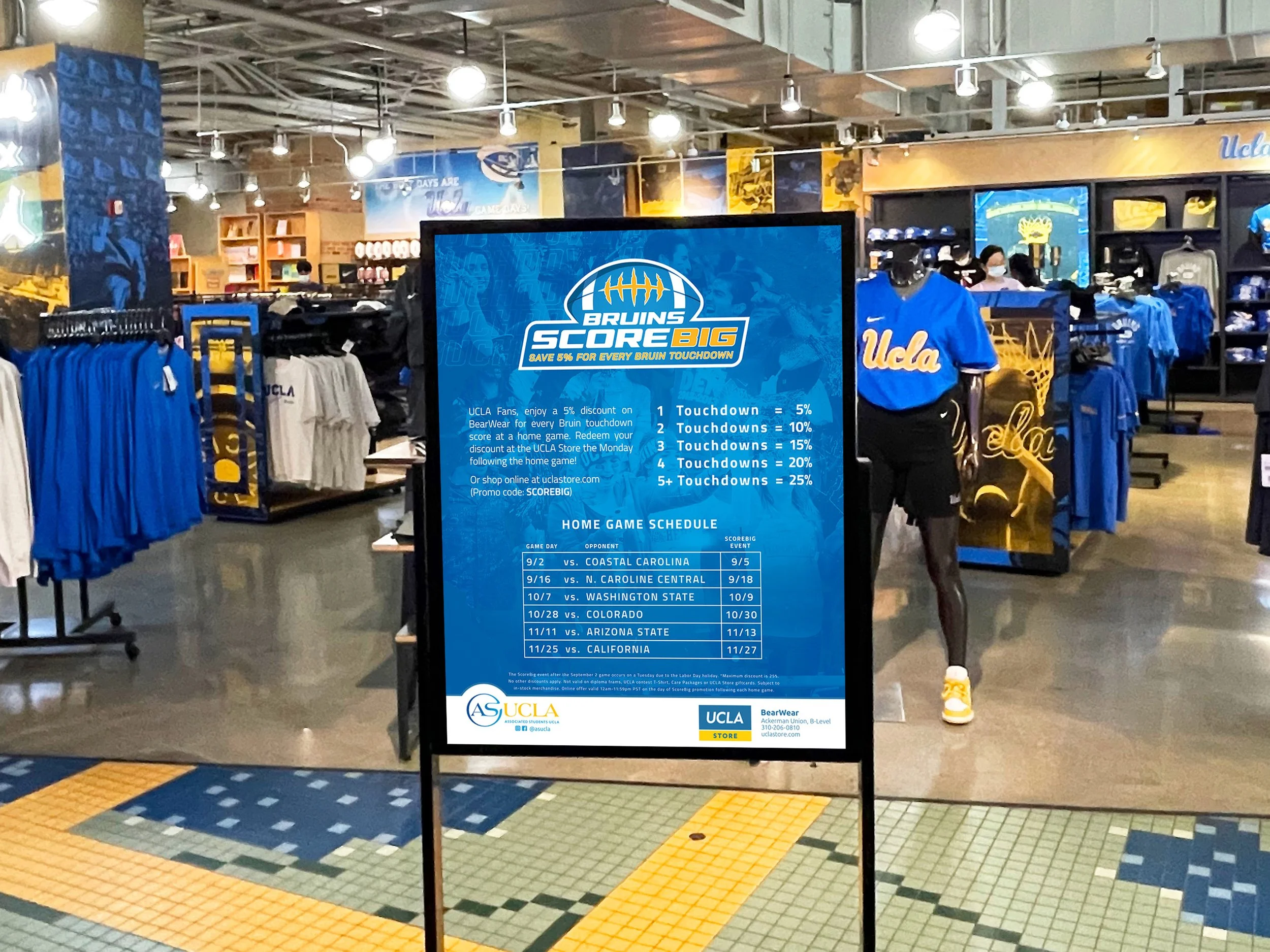 The modernized aesthetic improves brand presence, with bold typography and high-contrast UCLA colors that enhance visibility. The new logo adapts seamlessly across storefront LEDs, in-store displays, and digital platforms, ensuring brand consistency. Its sleek and professional look aligns with contemporary marketing trends, making the promotion more impactful and recognizable in retail and game-day environments.