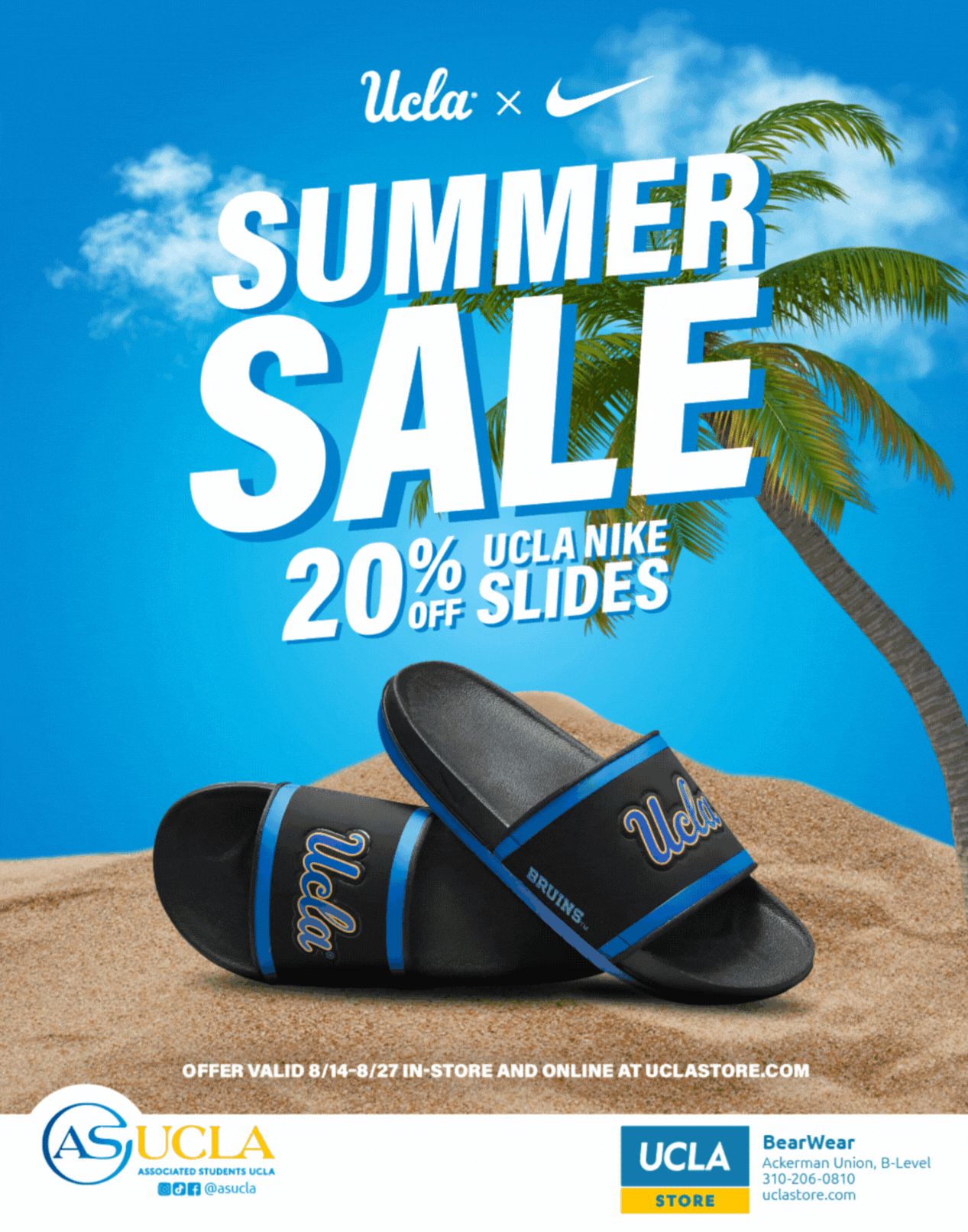 Occasionally, I would get to work on certain promotional signage for UCLA x NIKE merchandise, from new releases (Nike Pegasus 39- Left) to seasonal promotions/ sales (UCLA x Nike Summer Sale- Right).
